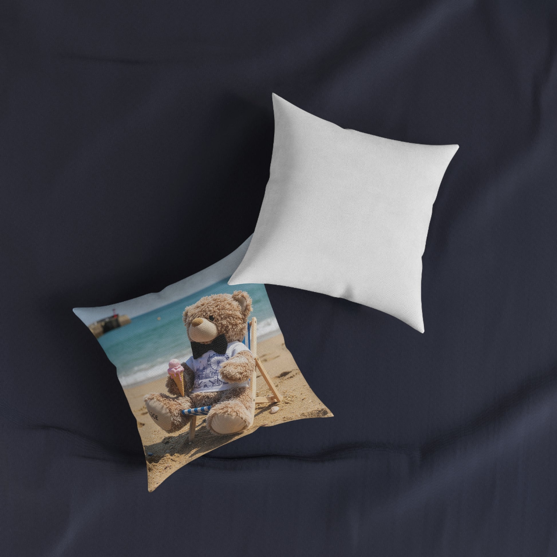 Teddy on Tour Candy Bear at Looe Beach Square Pillow